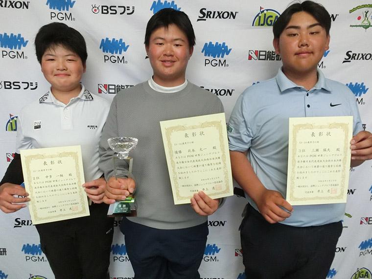 13-14歳の部男子は、北本太一(奈良・郡山西中3年)が2バーディー、1ボギーの1アンダー71で回り、ただ一人アンダーパーの通算1アンダー143の好スコアで優勝した。2位争いは混戦となり、通算6オーバーで3人が並んで、日本代表を決めるプレーオフに突入。1ホール目でバーディーを取った中多一翔(かずと、愛知・高浜中2年)が世界ジュニアゴルフ選手権(7月7~9日、米カリフォルニア州サンディエゴ)の日本代表切符を手にした。